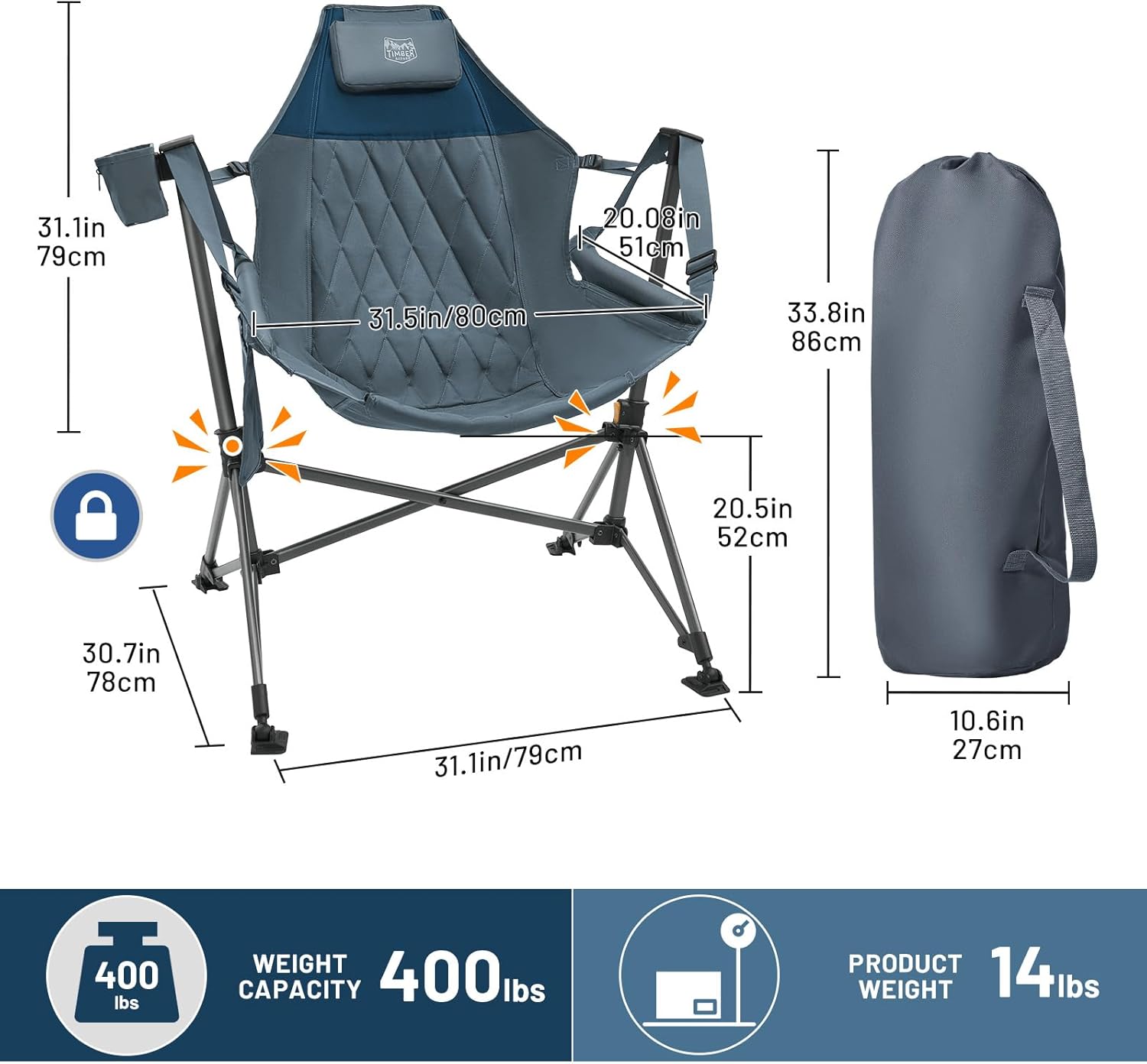 Crafted from durable materials, this portable folding rocking camping chair is built to withstand the rigors of outdoor use. The sturdy frame can support up to 400lbs, making it suitable for users of all sizes. Plus, the compact folding design allows for easy transport and storage, so you can take your hammock chair wherever your adventures lead.